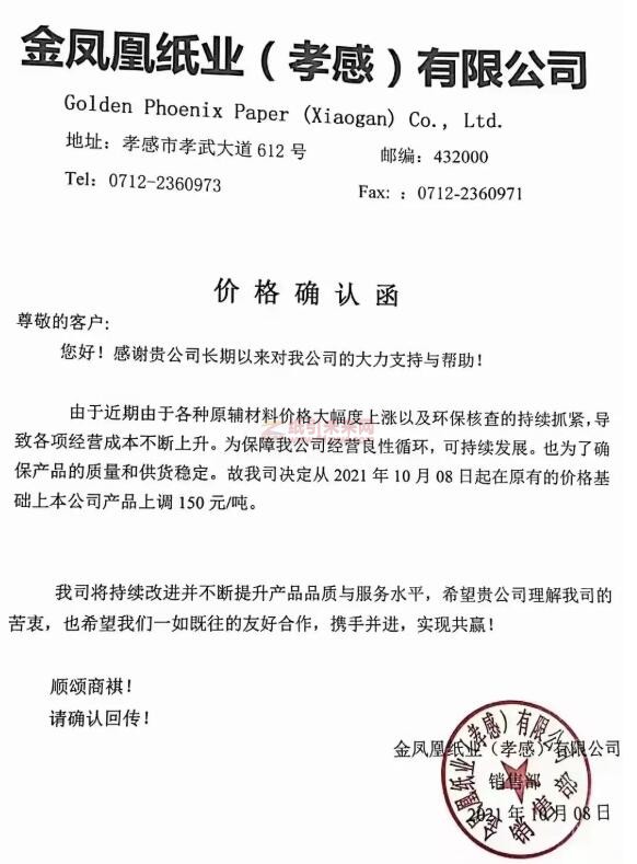 金鳳凰紙業(yè)(孝感)有限公司也發(fā)布價格確認函表示,由于近期各種原輔材料價格大幅度上漲以及環(huán)保核查的持續(xù)抓緊,導致各項經(jīng)營成本不斷上升。為保障公司經(jīng)營良性循環(huán),可持續(xù)發(fā)展,也為了確保產(chǎn)品的質(zhì)量和供貨穩(wěn)定,故公司決定從2021年10月08日起在原有的價格基礎(chǔ)上本公司產(chǎn)品上調(diào)150元/噸。