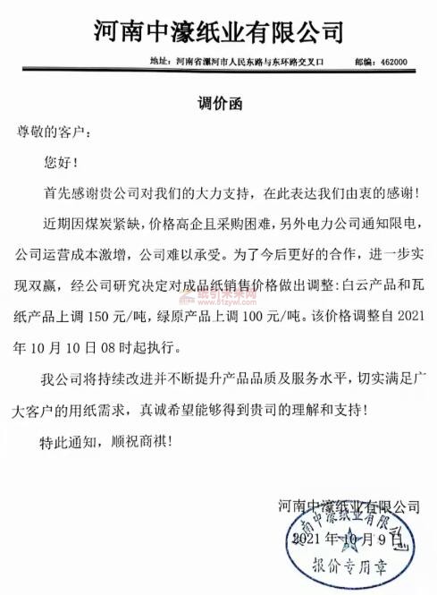 河南中濠紙業(yè)有限公司調(diào)價函稱,近期因煤炭緊缺,價格高企且采購困難,另外電力公司通知限電,公司運營成本激增,公司難以承受。為了今后更好的合作,進一步實現(xiàn)雙贏,經(jīng)公司研究決定對成品紙銷售價格做出調(diào)整:白云產(chǎn)品和瓦紙產(chǎn)品上調(diào)150元/噸,綠原產(chǎn)品上調(diào)100元/噸。該價格調(diào)整自2021年10月10日08時起執(zhí)行。