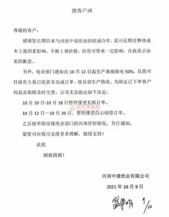在宣布產(chǎn)品調(diào)價的同時,河南中濠紙業(yè)還發(fā)函表示將暫停接受部分訂單:電業(yè)部門通知自10月12日起生產(chǎn)基地限電50%,且我司目前有大量己收款未完成訂單。按目前生產(chǎn)情況,為保證已下單客戶利益及保障及時交貨,公司無奈做出如下決定: