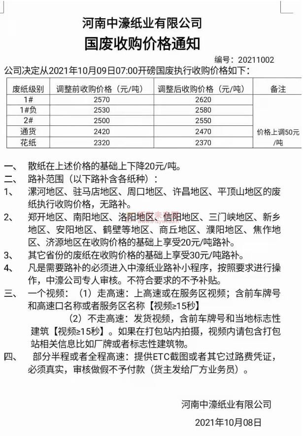 另值得注意的是,河南中濠紙業(yè)還另外發(fā)布了一則國廢收購價格通知,表示自2021年10月9日國廢收購價格上調(diào)50元/噸。