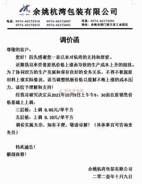紙引未來(lái)網(wǎng)訊 9月25日,浙江寧波紙板廠集體漲價(jià),一天之內(nèi)近30家企業(yè)發(fā)布漲價(jià)函,周邊城市迅速響應(yīng);同時(shí),玖龍四大基地宣布國(guó)慶后(10月9日)原紙?jiān)贊q100元/噸;山鷹10月8日起所有包裝紙價(jià)格上調(diào)200元/噸。
