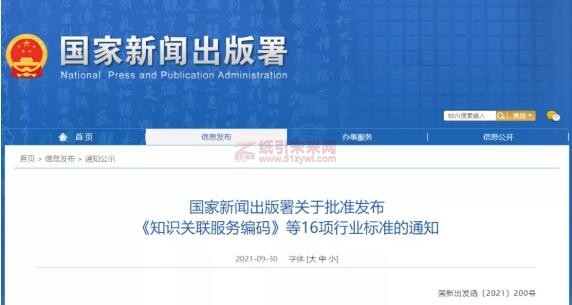 根據新聞出版領域行業標準制修訂工作安排,全國新聞出版標準化技術委員會組織編制了《知識關聯服務編碼》等5項行業標準,全國印刷標準化技術委員會組織編制、修訂了《印刷智能制造術語》等11項行業標準。經審核,現批準發布該16項行業標準,具體標準編號和名稱如下。