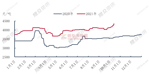 以下游瓦楞紙市場為例,本周期瓦楞紙含稅均價4269元/噸,環比上漲2.62%,同比上漲19.75%。從上圖可看出,進入10月份,國內瓦楞紙市場進入上行通道,主要原因在于:一、龍頭紙企于本月9日和13日兩次上調瓦楞價格,累計漲幅為200元/噸,各中小紙企積極跟漲。二、受能耗雙控政策影響,國慶期間各大紙企對部分產線進行停機檢修,華東、華南及東北等地多數中小紙企開工亦處低位,故原紙供應緊俏。三、原紙供應緊量推動下游紙板紙箱廠拿貨積極性提高,紙企出貨良好,庫存中低位呈現。四、原料廢黃板紙價格穩中上漲,疊加煤、電、氣等動力成本漲幅明顯,成本推力增強。