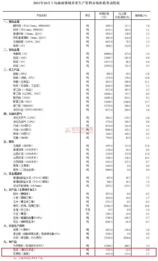 紙引未來網訊 國家統計局官網消息,據對全國流通領域9大類50種重要生產資料市場價格的監測顯示,2021年10月上旬與9月下旬相比,37種產品價格上漲,10種下降,3種持平。