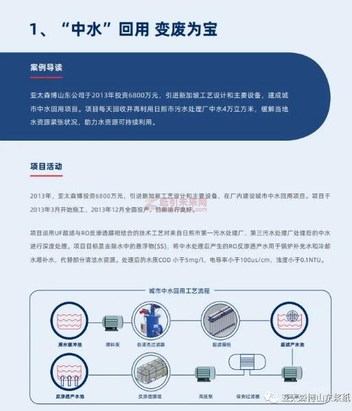 2013年,亞太森博投資6800萬元,引進新加坡工藝設計和主要設備,在廠內建設城市中水回用項目。項目于2013年3月開始施工,2013年12月全面投產,目前運行良好。