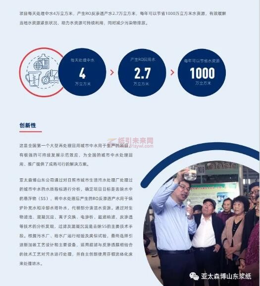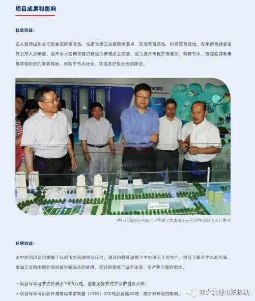 亞太森博山東公司于2013年投資6800萬元,引進新加坡工藝設計和主要設備,建成城市中水回用項目。項目每天回收并再利用日照市污水處理廠中水4萬立方米,緩解當地水資源緊張狀況,助力水資源可持續利用。
