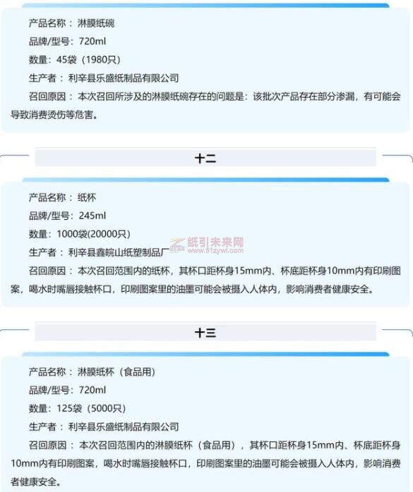 紙引未來(lái)網(wǎng)訊 11月2日,據(jù)國(guó)家市場(chǎng)監(jiān)管總局缺陷產(chǎn)品管理中心微信公眾號(hào)消息,存燙傷風(fēng)險(xiǎn),利辛縣樂(lè)盛紙制品有限公司召回45袋(1980只)淋膜紙碗;因紙杯油墨可能被攝入體內(nèi),利辛縣鑫皖山紙塑制品廠召回1000袋(20000只)紙杯,利辛縣樂(lè)盛紙制品有限公司召回125袋(5000只)淋膜紙杯(食品用)。