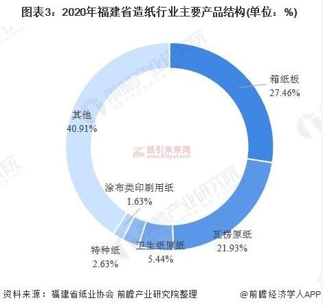 從主要產品產量結構來看,目前,福建省造紙行業產品主要以箱紙板和瓦楞原紙為主。2020年,福建省瓦楞原紙產量為175.13萬噸,占全省紙及紙板總產量的21.93%;箱紙板和產量為219.28萬噸,占全省總產量的27.46%;其他類型產品產量占比均在10%以下。