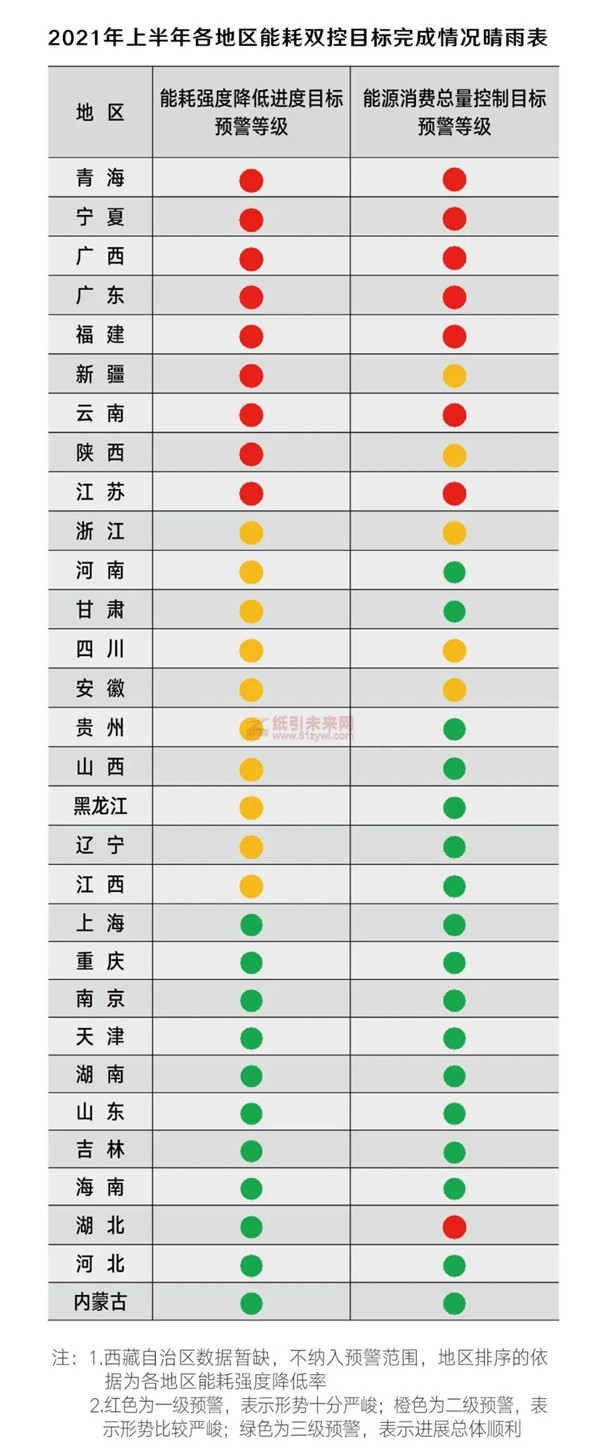 今年8月12日,國家發(fā)展改革委印發(fā)了《2021年上半年各地區(qū)能耗雙控目標完成情況晴雨表》,表中顯示,到年中不及半數(shù)省(區(qū)、市)能耗強度降低進展總體順利。青海、寧夏、廣西、廣東等9個省(區(qū)),上半年能耗強度不降反升,為一級預警(形勢十分嚴峻);10個省(區(qū))上半年能耗強度降低率未達到進度要求,為二級預警(形勢比較嚴峻)。國家發(fā)展改革委要求確保完成全年能耗雙控目標,特別是能耗強度降低目標。