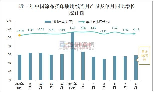 近一年中國涂布類印刷用紙當月產量及單月同比增長統計圖