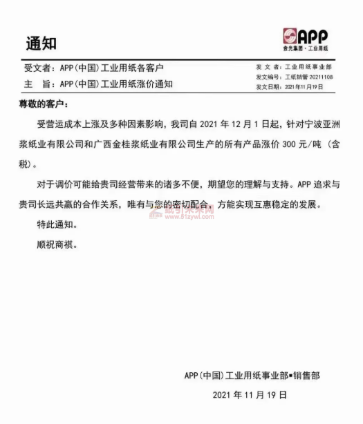 APP工業用紙:我司自2021年12月1日起,針對寧波亞洲漿紙業有限公司和廣西金桂漿紙業有限公司生產的所有產品漲價300元/噸(含稅)。
