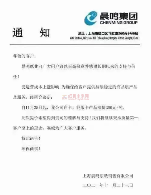 萬國紙業太陽白卡紙:自2021年11月25日起,我公司生產的全系列產品在目前執行價格基礎上統一漲價300元/噸。