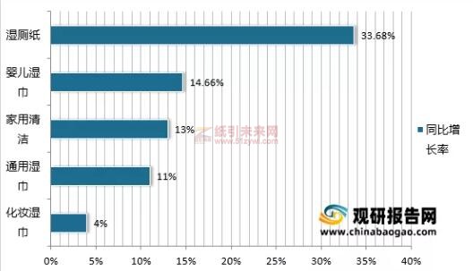 3)嬰兒濕巾市場占比最大,濕廁紙同比增速最快