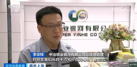 中冶紙業銀河有限公司總經理助理李宗輝:在我們成本端來講,漿價占據我們成本的百分之七八十以上。針葉漿我們從每噸4600元、4700元的價位,到現在為止已經漲破每噸6000元,漲價幅度最高每噸已經超過1200元;闊葉漿也從低位的每噸4200元、4300元,漲到了每噸4600元、4700元,漲了大概每噸300元到500元。