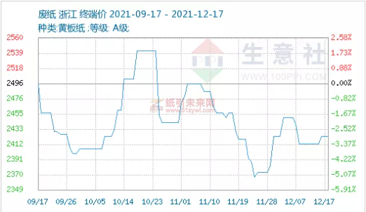紙引未來網(wǎng)訊 據(jù)生意社數(shù)據(jù)監(jiān)測(cè):本周廢紙收購(gòu)價(jià)格呈現(xiàn)穩(wěn)中有漲的趨勢(shì),上漲幅度相對(duì)平緩。12月17日浙江地區(qū)廢黃板紙A級(jí)收購(gòu)價(jià)格均價(jià)為2423.33元/噸,與周初(12月12日市場(chǎng)收購(gòu)均價(jià)2413.33元/噸)相比均價(jià)上調(diào)10元/噸,上漲了0.41%。而瓦楞紙價(jià)格則轉(zhuǎn)而下探,12月17日瓦楞原紙140g出廠價(jià)格均價(jià)為4010元/噸,與周初(12月12日瓦楞原紙140g出廠價(jià)格均價(jià)為4056元/噸)相比均價(jià)下調(diào)46元/噸,下降了1.13%。