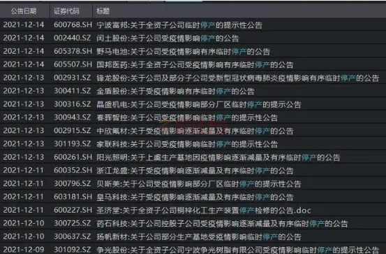 為遏制疫情擴散,浙江已有多家大型企業宣布停產。截至12月13日,發布了臨時停牌公告的17家A股上市公司中,11家都處于上虞區,主要集中于化工產業、機械零部件等產業。