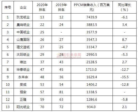 曼談紙業整理榜單發現,2020年共有13家中國企業進入全球100強,9家企業進入全球50強。7家中國企業的排名比前一年有所提高。