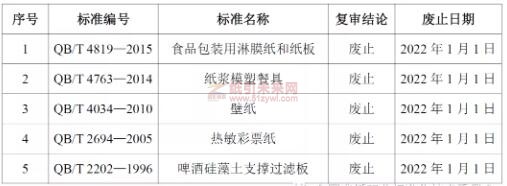 紙引未來網訊 根據中華人民共和國工業和信息化部公告(2020年第51號),QB/T 4819—2015《食品包裝用淋膜紙和紙板》等五項造紙行業標準已于2022年1月1日廢止。具體情況如下: