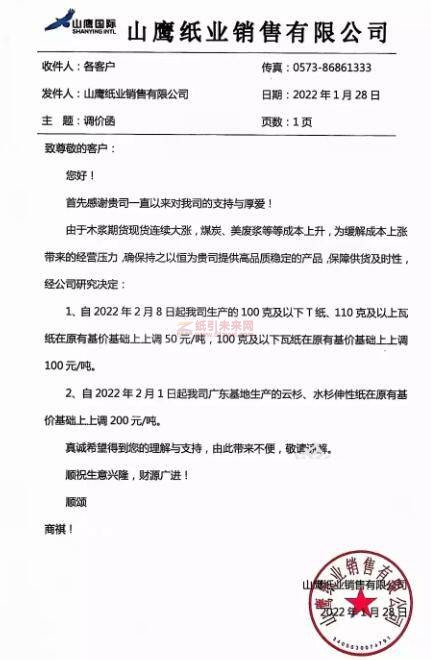 多家紙企宣布紙價上漲 漲幅為50-100元/噸