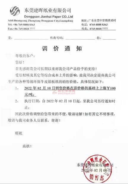 緊接著,廣東、河北、江蘇等地傳來新的紙價上漲消息。2月8日,玉田縣順發實業發布漲價函,宣布所有克重及品項的成品紙上調50元/噸;2月10日,東莞建暉紙業各種等級環保牛皮箱板紙銷售價格在原價格的基礎上上漲¥100元/噸。