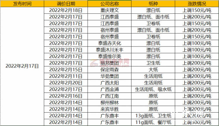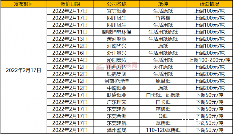 2月11日東莞發(fā)布了牛卡紙、70g以上芯紙上調(diào)50/噸、45-70克芯紙上漲100/噸通知,太倉玖龍發(fā)布玖牛、海牛牛卡紙上漲100/噸、其他牛卡上漲50/噸通知;2月13日東莞建航發(fā)布高克重瓦紙上漲30/噸的通知;2月14日福建聯(lián)盛、東莞順裕、江西蘆林、東莞金田、東莞金洲、浙江義南、河北新材料、河南鴻泰、江蘇凱盛、金紅葉均發(fā)布漲價通知;2月17日理文、泰盛、鼎豐、宜賓、聚源、建暉等企業(yè)發(fā)布通知對相關(guān)產(chǎn)品進行調(diào)價。