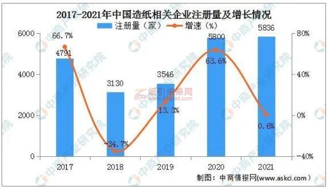 近年來,由于“禁廢令”導致原料需求缺口持續擴大,2019年不少企業紛紛布局造紙產業,造紙相關企業注冊量3546家,同比增長13.3%,較2018年增長明顯;2020年全國共新增造紙企業5800家,同比增長63.6%。最新數據顯示,2021年我國造紙相關企業注冊量5836家,增速有所放緩,同比增長0.6%。