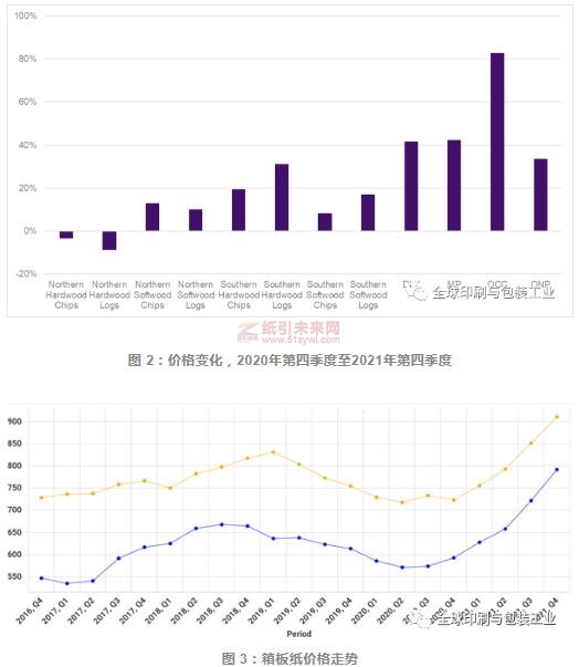 這兩個(gè)因素最終推高了箱板紙價(jià)格。在圖3中,我們可以看到瓦楞原紙和掛面紙板的貿(mào)易衍生國(guó)內(nèi)價(jià)格走勢(shì)。在2021年期間,這兩種產(chǎn)品的價(jià)格穩(wěn)步上漲,箱板紙價(jià)格達(dá)到910美元/噸,瓦楞紙價(jià)格達(dá)到791美元/噸,與2020年第四季度相比分別上漲約26%和32%。