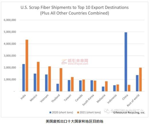 這些國(guó)家和地區(qū)的進(jìn)口都在很大程度上彌補(bǔ)了對(duì)中國(guó)市場(chǎng)出貨量的暴跌,后者減少了約89%。具體而言,中國(guó)在2021年進(jìn)口了54.8萬(wàn)噸美國(guó)廢紙,低于前一年的497萬(wàn)噸。最后,美國(guó)對(duì)韓國(guó)的廢紙出貨量下降了3%。