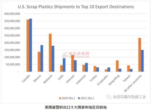 其他國(guó)家和地區(qū)大幅削減了從美國(guó)進(jìn)口的數(shù)量,包括中國(guó)香港(下降72%)、中國(guó)臺(tái)灣(下降56%)、馬來(lái)西亞(下降32%)、越南(下降31%)和土耳其(下降24%)。未進(jìn)入2021年前10名的所有其他國(guó)家和地區(qū)的總和下降了35%。到目前為止,加拿大仍然是廢塑料的最大進(jìn)口國(guó)。在馬來(lái)西亞新政實(shí)施后,加拿大從2019年開(kāi)始躍居第一。