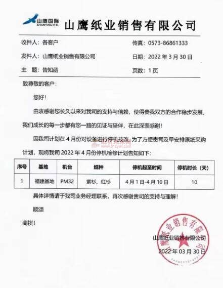 生產(chǎn)牛卡紙的PM22,將在4月10日-4月26日期間停機(jī)16天;