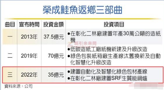 順帶一提,榮成紙業(yè)早前還宣布,將繼續(xù)響應(yīng)政府政策,擴大回臺投資,未來三年將投下35億元(新臺幣),建置自動化及智慧化綠色包裝產(chǎn)線、以及SRF生質(zhì)能鍋爐,以呼應(yīng)環(huán)保永續(xù)的產(chǎn)業(yè)大趨勢。