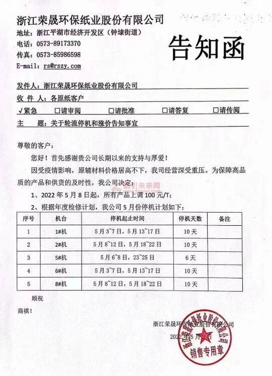 紙引未來網訊 5月2日,浙江榮晟環保紙業股份有限公司發函稱,受疫情影響,原輔材料價格居高不下,公司經營深受重壓,為保障高品質的產品和供貨的及時性,故決定自5月8日起所有產品上調100元/噸,旗下五大紙機將在近期各自停機6-10天。