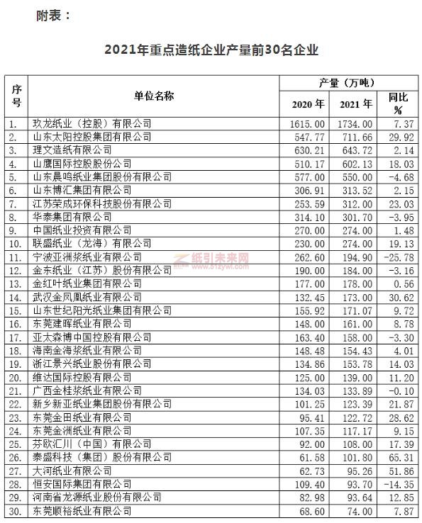 紙引未來網訊 據中國造紙協會統計,制漿造紙及紙制品全行業2021年完成紙漿、紙及紙板和紙制品合計28021萬噸,同比增長9.89%;其中:紙及紙板產量12105萬噸,較上年增長7.50%;紙漿產量8177萬噸,較上年增長10.83%;紙制品產量7739萬噸,較上年增長12.81%;全行業營業收入完成1.50萬億元,同比增長14.74%;實現利潤總額885億元,同比增長6.92%。