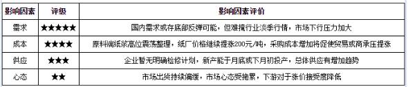 國(guó)內(nèi)需求在區(qū)域流通有序恢復(fù)的前提下或底部小幅反彈,但難掩行業(yè)淡季行情。紙廠繼續(xù)提漲200元/噸,貿(mào)易商在成本壓力下仍有拉漲紙價(jià)以改善目前倒掛現(xiàn)狀的訴求,但供應(yīng)端壓力有增加趨勢(shì),且市場(chǎng)偏空心態(tài)增加,市場(chǎng)整體下行壓力增加。因此5月白卡紙市場(chǎng)或小幅震蕩調(diào)整,五一過后市場(chǎng)存拉漲可能,但市場(chǎng)上行阻力較大,若拉漲不利則將進(jìn)入下行調(diào)整階段。