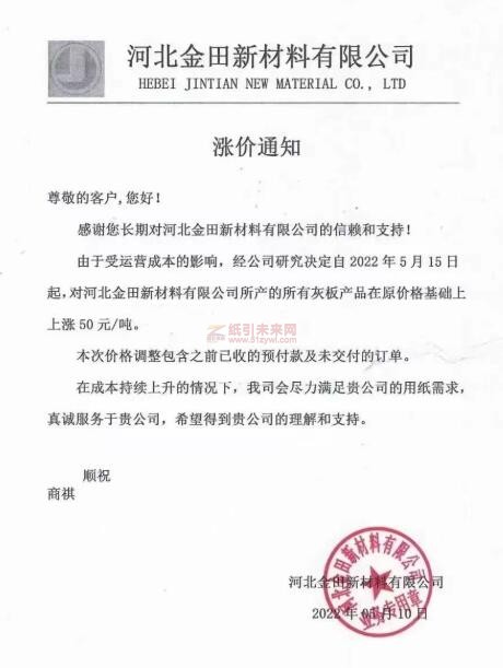 與此同時,江西撫州富圣實業(yè)、山東棗莊華潤實業(yè)、河北金田紙業(yè)等多家紙企亦發(fā)布漲價函,宣布灰板產(chǎn)品在原價格基礎(chǔ)上上漲50-100元/噸,且多數(shù)紙企表示本次價格調(diào)整包含預(yù)付款及未交付訂單。