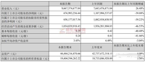 太陽紙業一季度營收96.67億元,同比增長26.48%;凈利潤6.75億元,同比下滑39.09%。