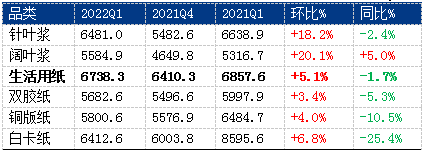 2022年一季度生活用紙行情呈現較為震蕩態勢,木漿生活用紙均價達到6738.3/噸,環比漲5.12%,同比跌1.74%。;其中季度最高點為7100/噸,季度最低點為6400/噸。造成一季度行情走勢的主要原因是:供應方面,春節前市場備貨逐漸接近尾聲,局部地區紙企多提前停機放假,2月份受春節及冬奧會影響,局部地區于2月底才陸續恢復生產,3月份受出貨壓力及公共衛生事件影響,部分紙企庫存承壓,降低開工,一季度市場供應整體呈現減少趨勢。需求方面,春節后下游備貨需求恢復較慢,疊加公共衛生事件影響,物流發運受限,下游及終端需求受到一定抑制,需求支撐減弱。成本方面,原料價格高位攀升,闊葉漿價格維持高位,紙企成本壓力增加,利潤呈現倒掛趨勢,業者多挺價意愿強烈。
