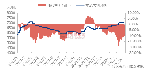 如圖3,2022年一季度,中國噴漿工藝制木漿生活用紙利潤達到-653.2/噸,毛利率-9.7%。一季度木漿生活用紙利潤延續倒掛趨勢,在3月初利潤達到最低點-1295.9/噸。主要原因是一季度木漿價格呈現高位上漲趨勢,闊葉漿漲幅達120.1%,針葉漿漲幅達18.2%,在成本帶動作用下,生活用紙價格上揚,但需求不足導致上漲乏力,木漿生活用紙利潤仍延續倒掛趨勢。