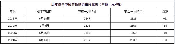 由上圖可見,2018年至2021年端午節前后國內廢黃板紙市場價格波動幅度偏小,經過查驗歷史數據,2018年至2021年端午節前后國內廢黃板紙市場價格以上移為主,其中2019年上漲最多為58元/噸,幅度為上漲2.07%。