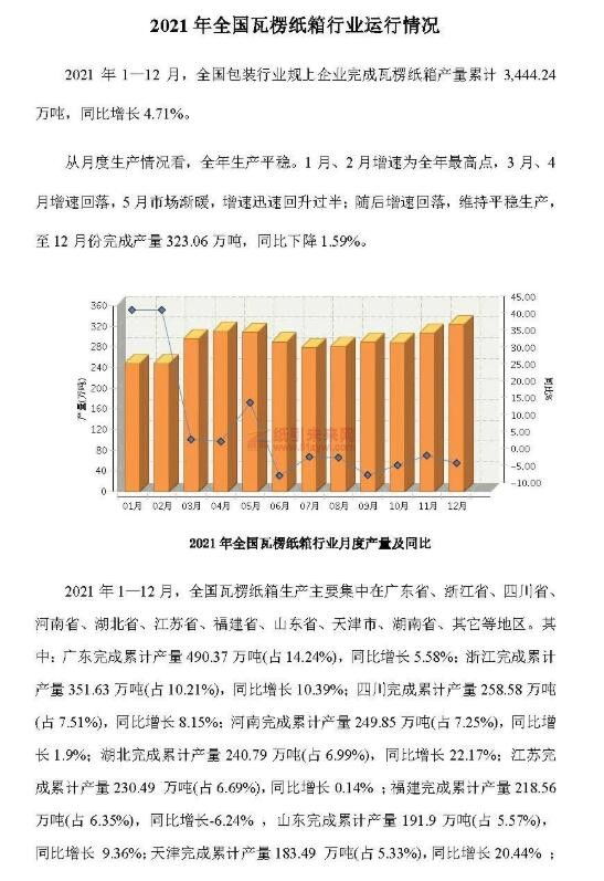 紙引未來網訊 2022年6月8日,中國包裝聯合會公布了2021年全國瓦楞紙箱運行情況。2021年1-12月份,國內包裝行業規上企業完成瓦楞紙箱產量累計3444.24萬噸,同比增長4.71%。
