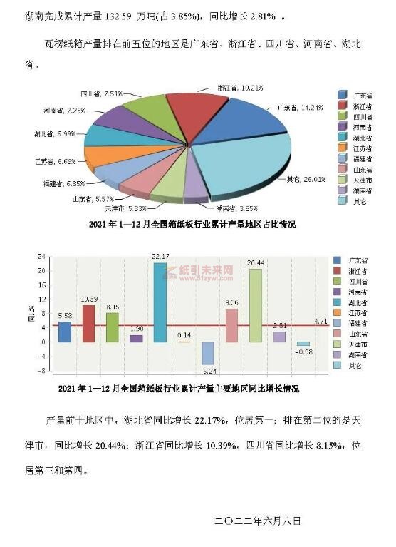 分地區來看,2021年1-12月,全國瓦楞紙箱產量前十地區分別為:廣東省、浙江省、四川省、河南省、湖北省、江蘇省、福建省、山東省、天津市、湖南省,具體情況如下: