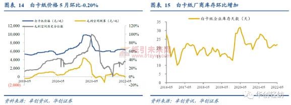 白卡紙需求內縮外穩;紙價小幅下降,庫存環比上漲。5月白卡紙平均價格為6420.5元/噸,環比下降0.20%,同比下降31.10%;需求端,出口訂單較穩,一定程度可對沖國內下游需求收縮。由于出口增長空間有限,整體企業庫存呈現增加趨勢,截至5月底,白卡紙企業庫存天數21.95天,較4月增加0.61天;企業庫存為69.94萬噸,環比上漲1.96萬噸,同比下降14.49萬噸。當前白卡紙的毛利空間已處于歷史較低。白板紙5月企業庫存環比上漲10.8%,庫存天數在24天左右,下游需求低迷,經銷商備貨心態謹慎。