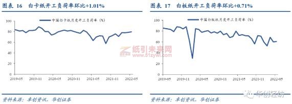 白卡紙開工負荷率逐漸恢復到正常水平,白板紙復工仍存問題。5月疫情漸好,下游白卡紙消費量有望回升,相應5月白卡紙開工率提升1.01個百分點,基本維持4月的上漲趨勢。白卡紙生產走向正?;?,5月白卡紙產量同比增加38.82%。5月白板紙開工率略有回調,上漲0.71個百分點,但生產仍處于低迷狀態。