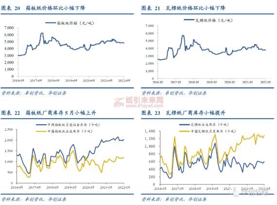 5月廢紙價格、庫存環比小幅提升。廢黃板紙標桿均價為2350元/噸,環比上升0.38%,同比上升4.26%;22年1月庫存上升至峰點開始回落,至四月滑落接近于最低水平,2022年5月底廠商黃板紙庫存小幅上升,增加至7天,環比增加1天。
