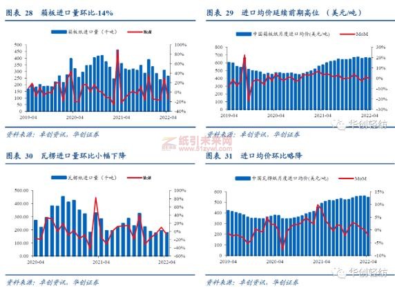 物流回溫,包裝紙開工率提升。受疫情影響,下游家電、飲料需求低迷,5月箱板紙、瓦楞紙價格略有下降,5月下旬疫情漸好,物流恢復有望帶動需求回升,5月開工情況明顯改善,箱板紙、瓦楞紙開工率分別環比上漲9.87%,7.24%;庫存方面,訂單成交情況一般,去庫壓力仍存。進出口方面,4月瓦楞紙進口量環比下降8%,箱板紙4月進口環比下降14%。