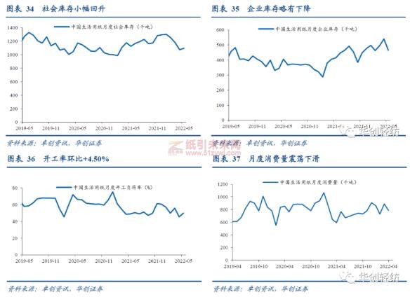 下游需求一般,企業去庫壓力仍存,開工率小幅提升。國際公共衛生事件的不穩定性依舊存在,疊加人口增長不及預期等均對生活用紙的需求增長產生一定制約,4月生活用紙消費量下降至78.54萬噸,環比下降11.8%,企業庫存略有下降,但仍處高位,紙企去庫壓力依然顯著。生活用紙5月開工率環比上漲4.50%,主要是受到第一,5月紙價明顯上漲,廠商生產積極性得以提升;第二,華東、華南地區少量新產能投放,略微帶動整體開工率的提升。