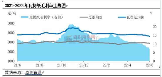 由下圖可見,6月份以來瓦楞紙毛利水平繼續下滑,隨著廢黃板紙市場價格的反彈,多數紙企表示瓦楞紙市場價格已經在成本線附近。此或反作用于廢黃板紙價格反彈走勢,拖累廢黃板紙價格反彈深度。