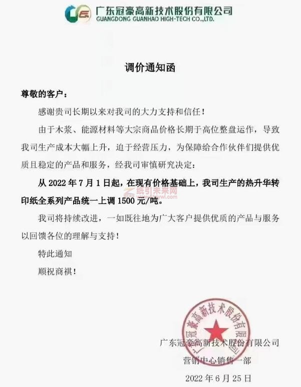 冠豪高新:7月1日起,我司生產(chǎn)的熱升華轉(zhuǎn)印紙全系列產(chǎn)品統(tǒng)一上調(diào)1500元/噸。