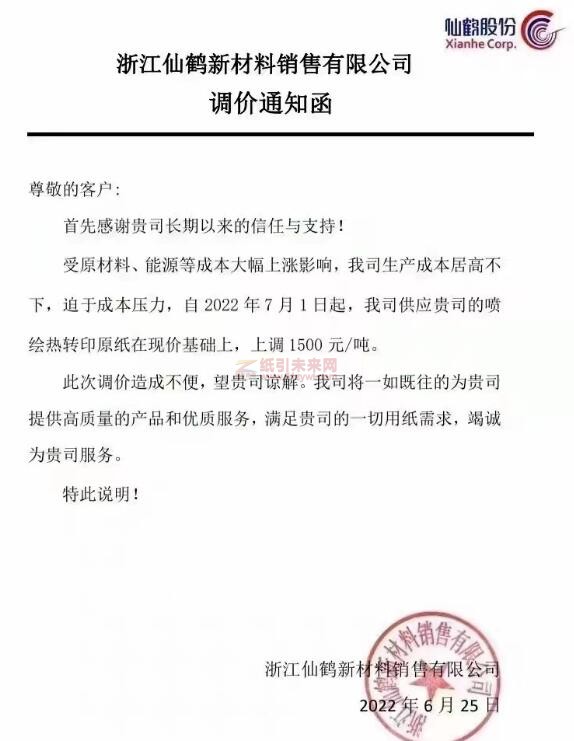 浙江仙鶴:7月1日起,我司供應(yīng)貴司的噴繪熱轉(zhuǎn)印原紙?jiān)诂F(xiàn)價(jià)基礎(chǔ)上,上調(diào)1500元/噸。