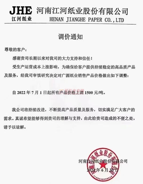 河南江河紙業(yè):7月1日起,所有產(chǎn)品價(jià)格上調(diào)1500元/噸。